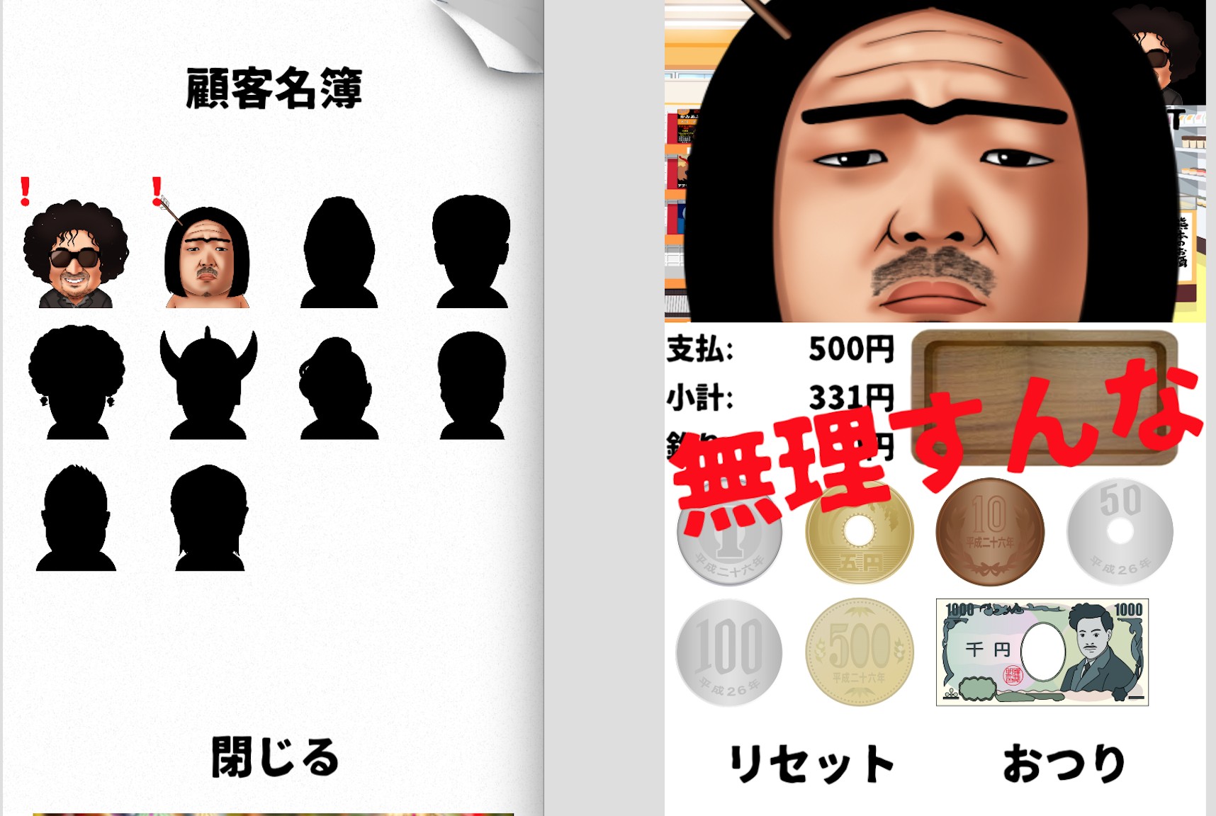 超個性的なキャラばかりで口癖もあって、お釣りを間違えたり時間切れになるとドーン!顔が迫って来て吐き捨てられます。