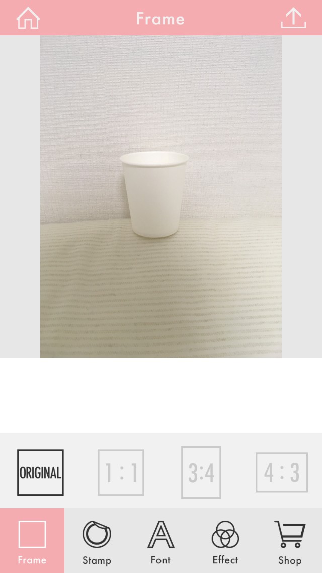 ちょっと簡単な写真で実際にこのアプリを使って加工していきたいと思います!①まずはFrameを選びます。「ORIGINAL」「1:1」「3:4」「4:3」の4つから選べます。要するに「縦にするか、横にするか」ってことですね。