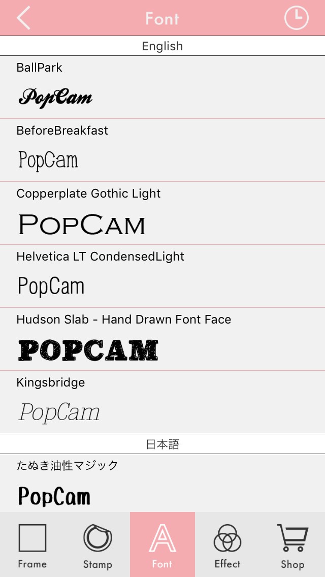Pop camというアプリはアーティストやキャラクターのスタンプで手軽に写真がかっこよくなる写真加工アプリだそうで、多くの有名人やタレントさんがそれを使って加工して、その加工した写真を、Instagramを始めとしたSNSに挙げているそうです!非常に簡単な仕様になっていて、加工したい写真を撮る、またはアルバムから選択し、それを「Frame」「Stamp」「Font」「Effect」の順に自分の好きなように加工していくだけです。これだけではぶっちゃけ他の写真加工アプリでも代用できそうなんですが、他と違うのはこの他に「Shop」というのもあり、そこにすごい種類のスタンプとフォントがあって、無料や有料のものがあるということなんです!簡単に作れるんですが、スタンプやフォントが充実しているので、他の人とは違ったデザインや、すごい写真が作れるんですね!