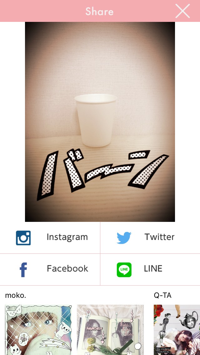 そして保存したらShareの画面が出てきました。InstagramとTwitterとFacebookとLINEの4つのアプリに共有できるそうですが、この画面がわざわざ自分でやるのではなく、写真を保存する過程に組み込まれているというのは本当にいいと思いました! また、その下の部分に、おそらく有名な方だと思うのですが、その方が加工した写真がいろいろあります。それをタップすると、詳細が見れ、¥120で購入することもできます! もし気に入ったのがあったら購入してみてもいいかもしれません!