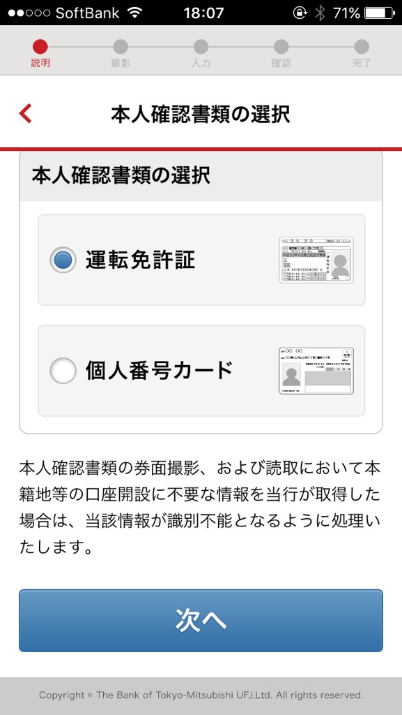 その後こちらのページが表示されるので、運転免許証か個人番号(マイナンバー)カードを選択し、【次へ】をタップします。