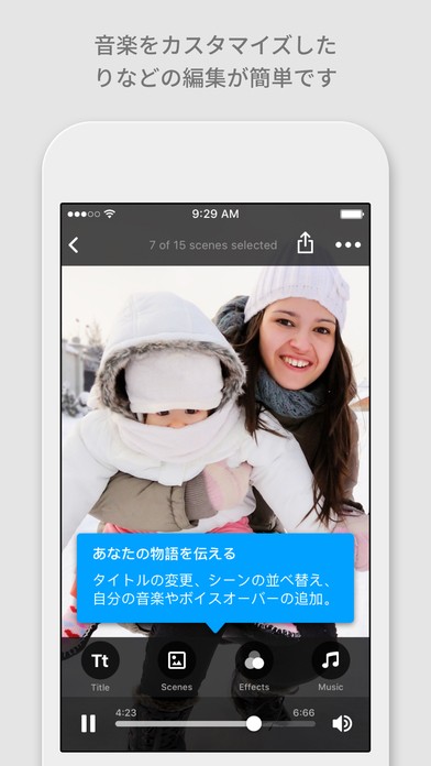 自分で作るのが好きな方には必要ないと思うかもしれませんね。でも、ちょっと待ってください。自分で作る時って意外とワンパターンなバージョンなることが多いと思いませんか? 自動作成では、アプリが最高の瞬間だと判断した写真でムービーを作成してくれます。自分ではそう思っていなかった写真がピックアップされると結構嬉しいんですよね。時には全く違った目線からムービーを作るのも面白いと思いますよ。もしも、編集を加えたい時には、写真を削除、追加することも出来ます。また、音楽やフィルター加工、エフェクト加工などの編集が出来ます。まずは、アプリに任せて、編集したければご自分で細かく編集してみるのもいいですね。使う人の事をよく考えて作られたアプリだと思います。