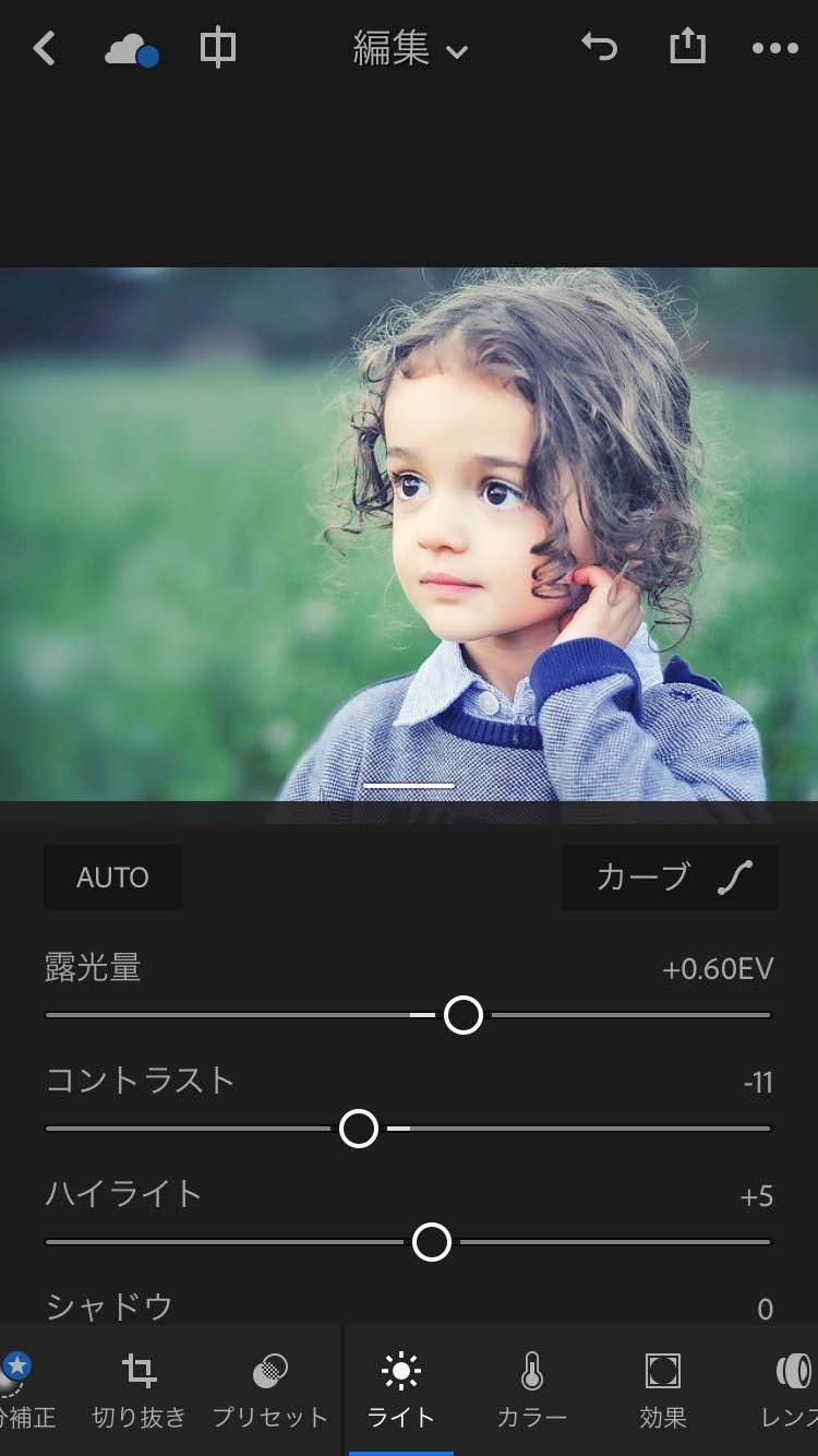 「ライト」では、露光量、コントラスト、ハイライトなど明るさの調整がメインです。