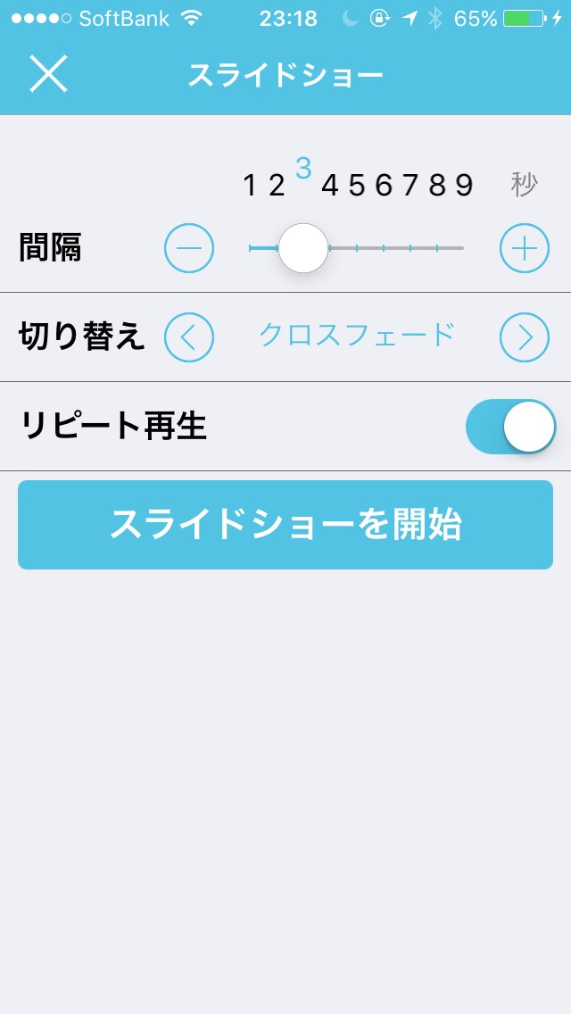 保存した写真をスライドショーにして楽しむこともできます。自分で「間隔」と「切り替えの方法」と「リピート再生をするかしないか」の設定をするだけで簡単にスライドショーとして楽しめます! 是非友達とでも、一人でも鑑賞してみてください!