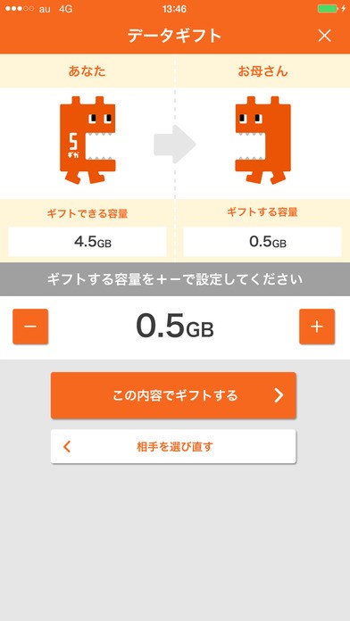 皆さん、家族で同じauのスマホを使っているという方もいらっしゃると思います。そんな方にぜひ知ってもらいたいのが、このアプリでは自分のデータを家族に送ることが出来るという事です。今まで、個人個人で見ていたデータの容量も家族間でやりくりが出来るようになりますね。余ったデータの有効活用が可能に。これからはお得に使えるようになるかもしれませんよ。