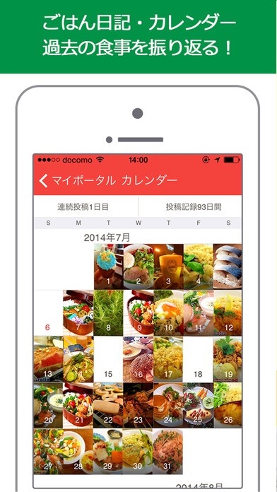アプリの画面下「マイポータル」の中のカレンダーにその日の写真が投稿されるので、食事の記録をつけるのが簡単です。
