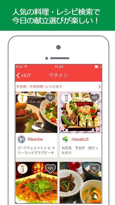 ※「人気のレシピ検索」・・レシピ付きで投稿された写真の下には赤字で「レ」マークがついています。その中でも人気が高いレシピをここで見ることができます。