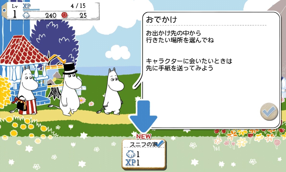 このゲームアプリはムーミン谷の生活を体験するのが目的の、ゆるっとしたゲームシステムになっています。