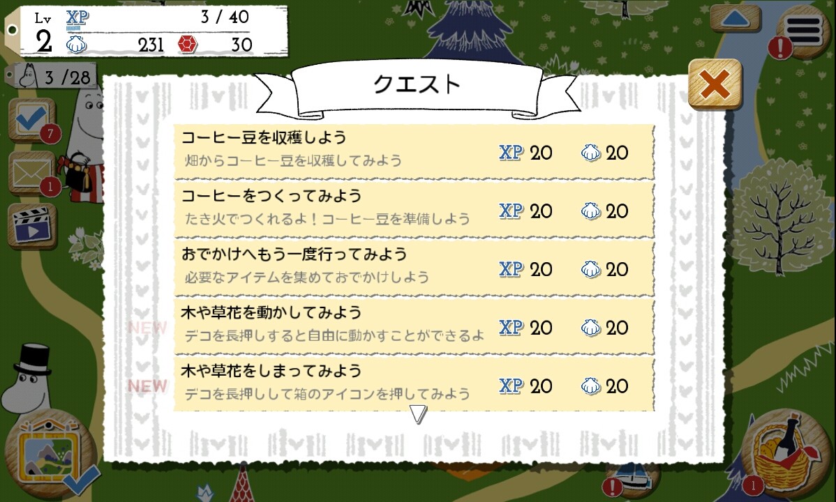 このようにいろいろなことができるムーミンのゲームアプリですが、基本的にはクエストをクリアしていくと話が進んでいきます。