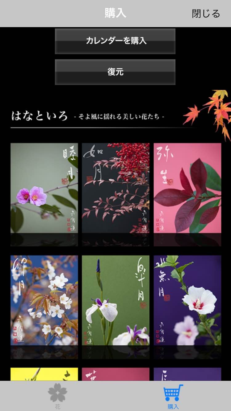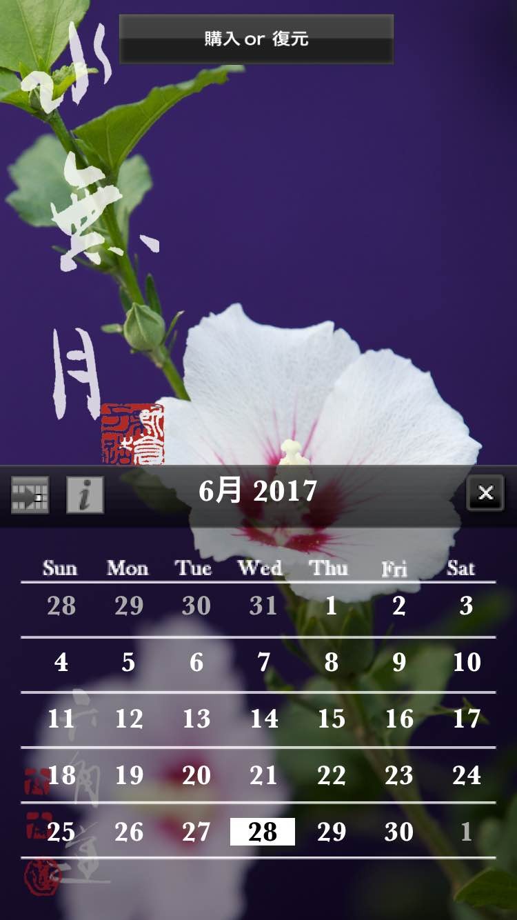 トップ画面の画面上部の「購入or復元」またはカレンダーの「 i 」のマークをタップすると有料コンテンツ購入画面へ移ります。