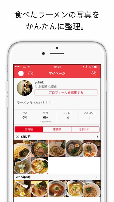 タイムラインに投稿すると、自分の記録が店舗、日付ごとに表示されるので、食べたラーメンの写真記録がすぐにわかります。