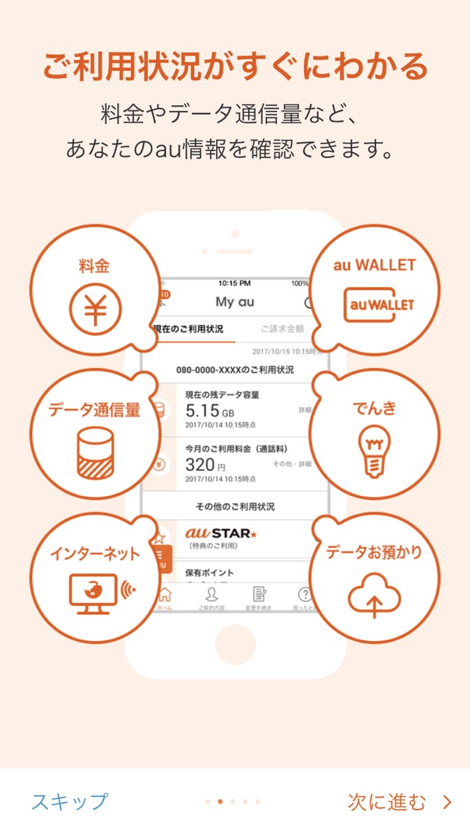 - 料金はもちろん、自身のau情報がいつでも確認可能。携帯電話の情報だけでなく、au電気やauほけんなどの契約内容も確認できます。