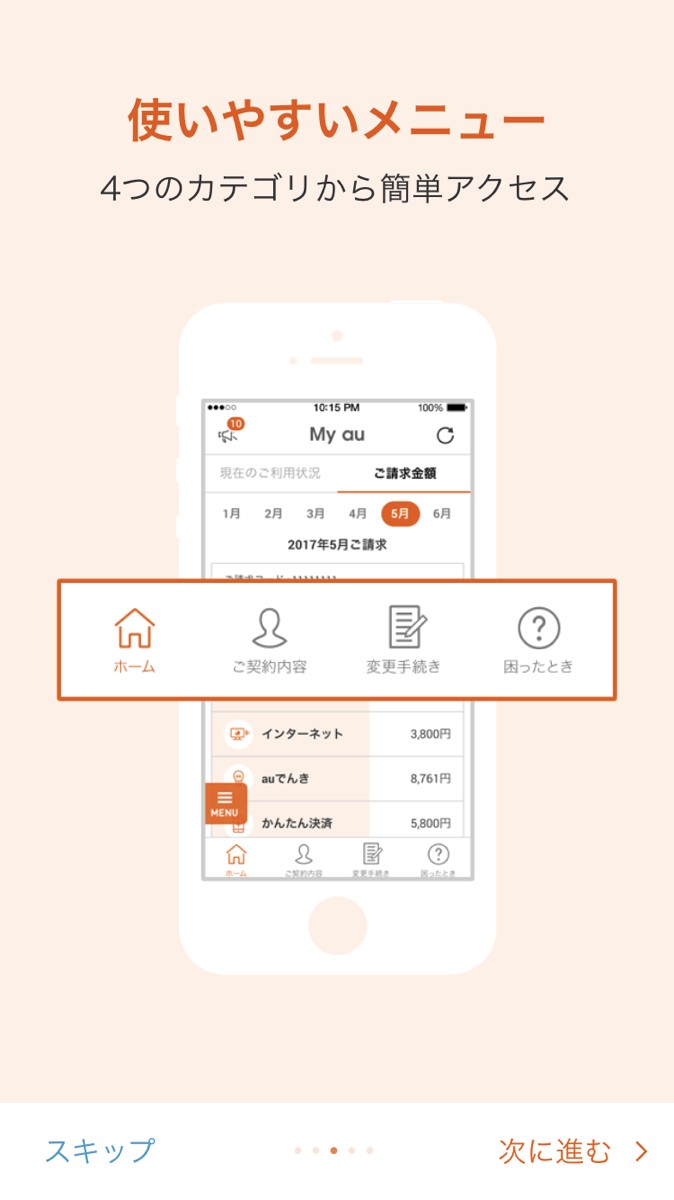 My auのメニューは大きく分けて4つのカテゴリに分類されています。画面下部にある4つのメニューについて解説します。