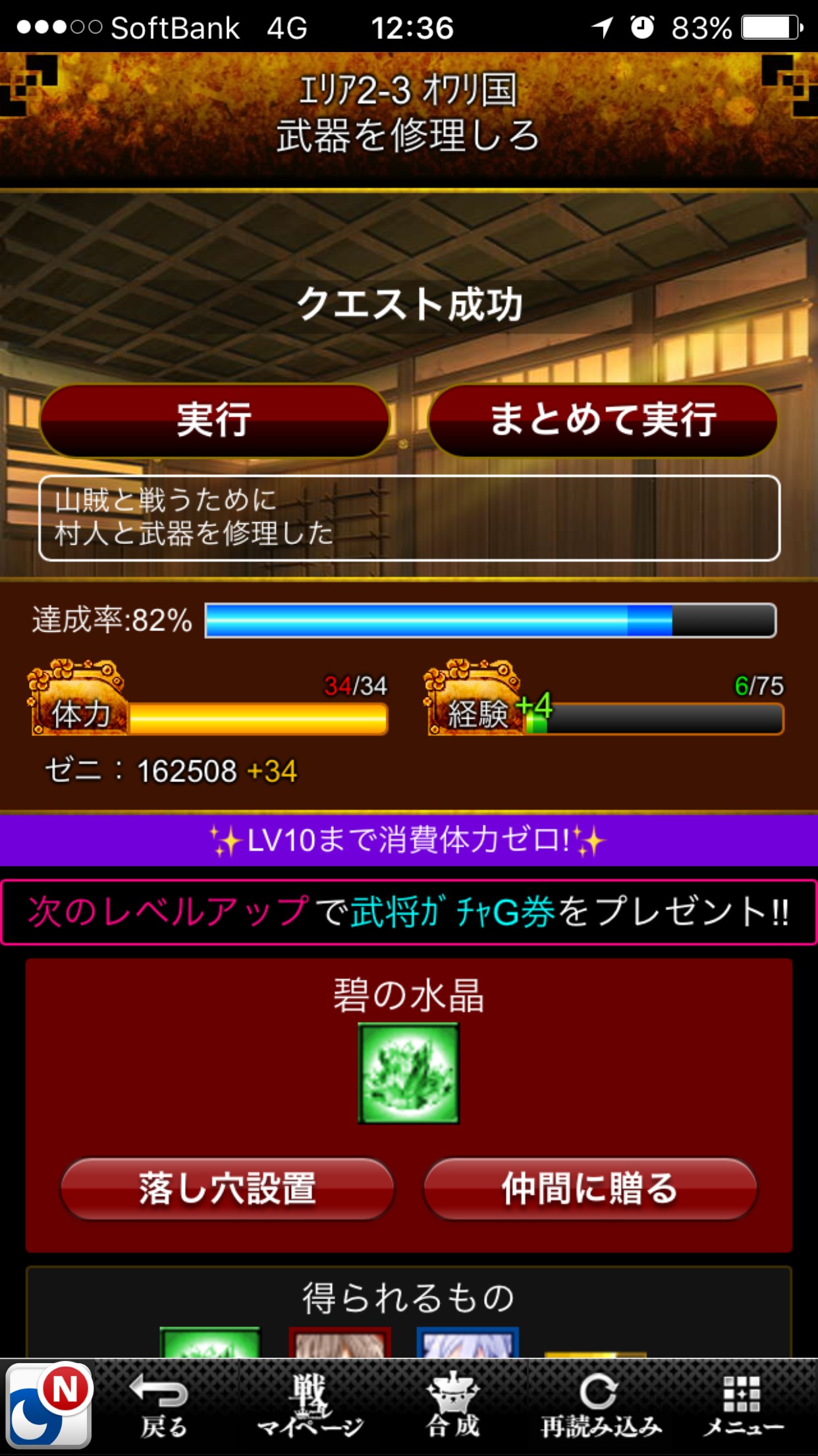 ユーザーは体力を消費してクエストを実行し、経験値およびゼニ(ゲーム内通貨)、武将カード、秘宝などの報酬を獲得します。