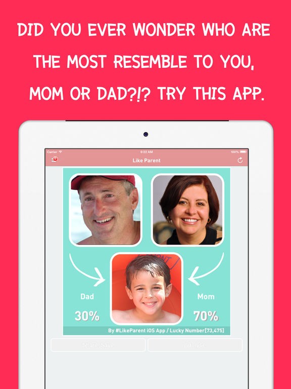 「Like Parent Original」は両親の写真と子供の写真を使って、どのくらい遺伝しているのかを見比べるおもしろアプリです。自分はいったいどっちに似ているのだろうと思ったときは、両親の顔写真を撮影してアプリ内で確認してみるといいでしょう。