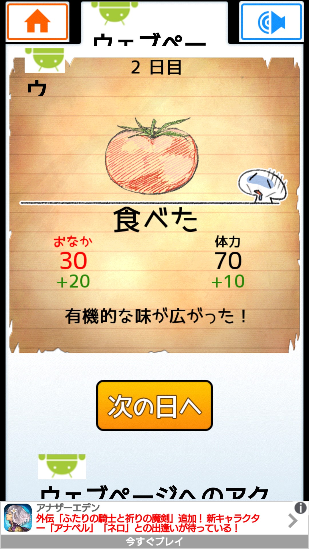 死ぬことなく無事に「食べた」ら、「おなか」と「体力」のパラメーターが回復します。感想コメントも楽しいのでお見逃しなく。