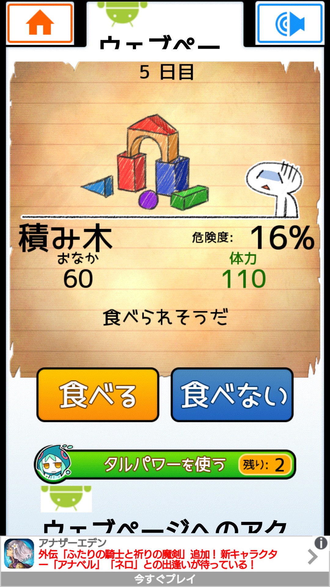 ゲームをスタートすると、出てきたもの(繰り返しますが、食べ物とは限りません)を「食べる」か「食べない」かを選びます。食べたら死ぬであろう確率を表す「危険度」、空腹度合いを表す「おなか」、そしてこれが尽きれば死ぬ、「体力」の3つのパラメーターと、一行コメントを参考に、「食べる」or「食べない」を選んで進みましょう。