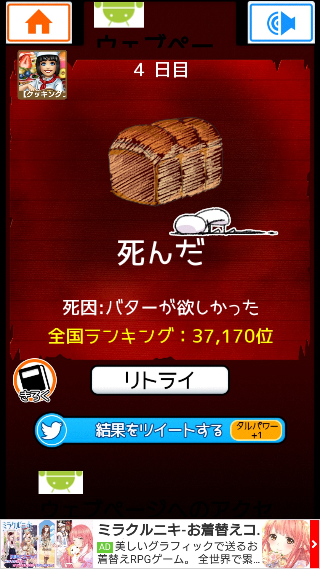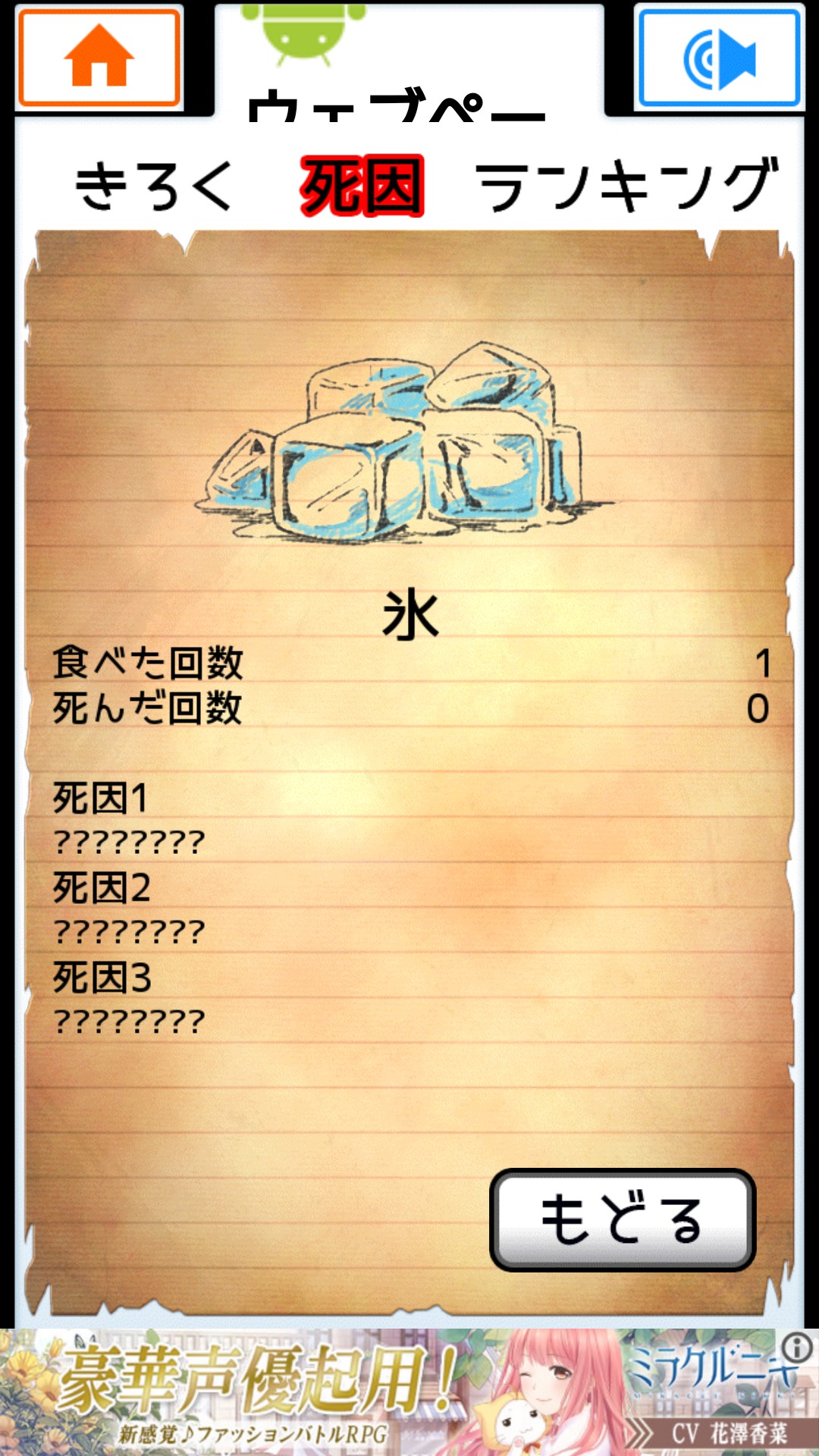 「きろく」をタップすると、最近の死因と、ランキングが見られます。自己ベストを見るとまだまだという感じですが、まさかフランスパンを食べて死ぬとは。