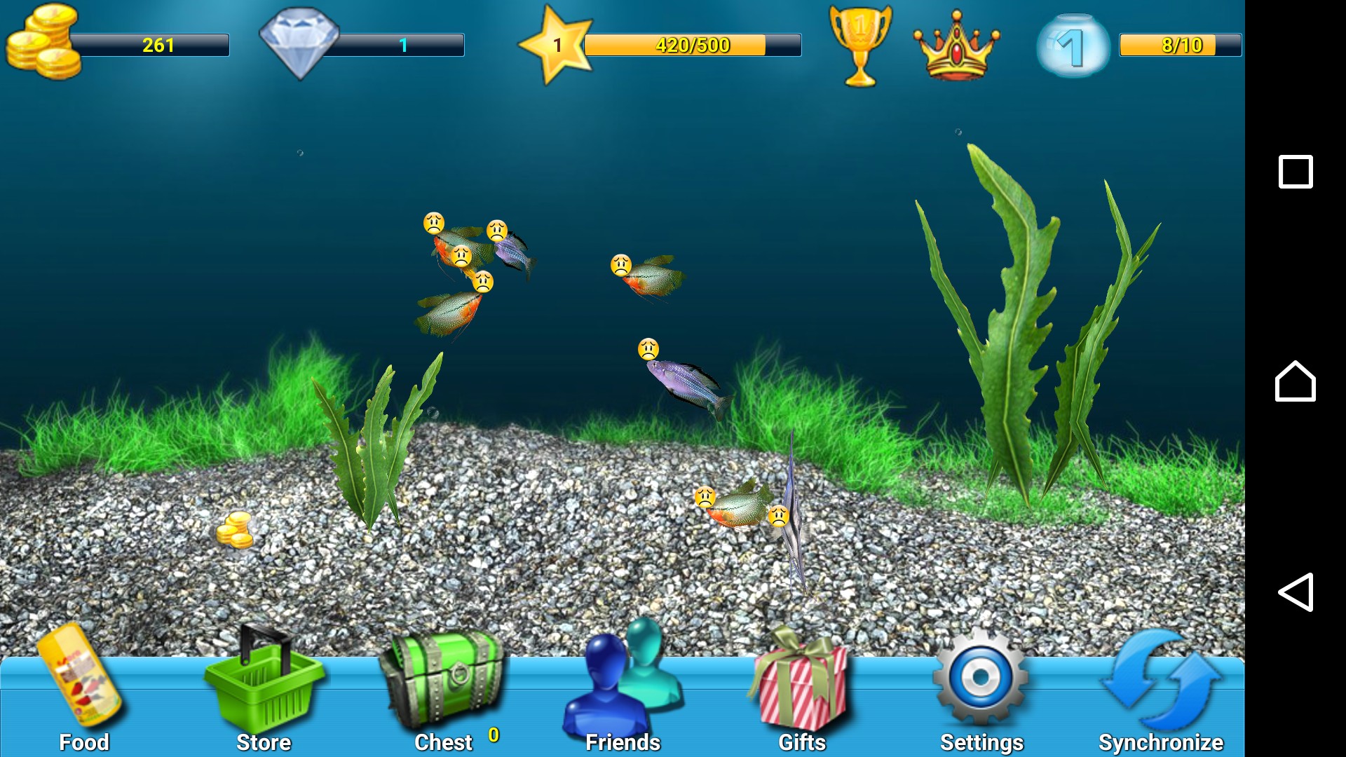 水槽が用意されたら、まずは餌をやってみましょう。画面一番右、黄色の入れ物をタップすると餌やりモードになり、タップしたところに餌を落とせます。綺麗な魚たちが群がってくるのを見ているだけで楽しいです。リアルのアクアリウムでは食べ残しの餌を処分したりする必要がありますが、これはそんなことしなくても大丈夫。まさにいいとこ取り。癒し系ミュージックに耳を傾けつつしばらくぼんやり眺めてみた後は、ちょっと魚をタップしてみましょう。魚の名前と成長度合いが分かります。
