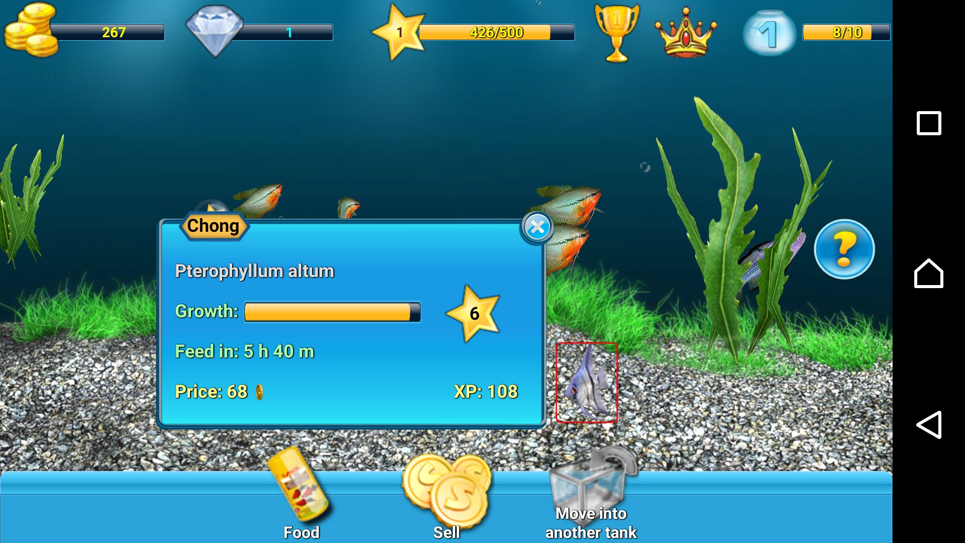 魚の種類の見分けがつくくらい育っていました。すぐ育ってくれる、これもバーチャルアクアリウムのいいところですね。育った魚をタップして見てみると、まだ育つ余地がありそう。楽しみですね。
