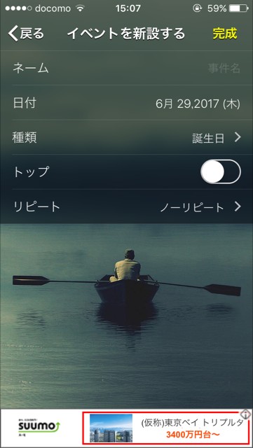 2.記念日やイベントの詳細を打ち込んだら、右上の「完成」をタップ!