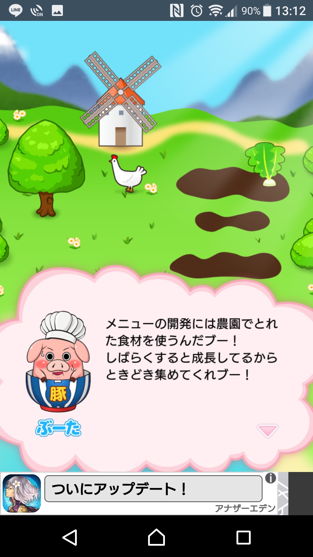 お店は構えたものの、メニューがなければ話になりません。まずは「メニュー」をタップして最初のメニューを開発しましょう。「ヒントを見る」からは、文字通りメニュー開発のヒントを見ることができます。ヒントどおりに卵とご飯を準備。できたものは!はい、当然卵かけご飯ですね。この材料は、シリーズ通しておなじみ、えみちゃんのじーじの農園から収穫できるようです。