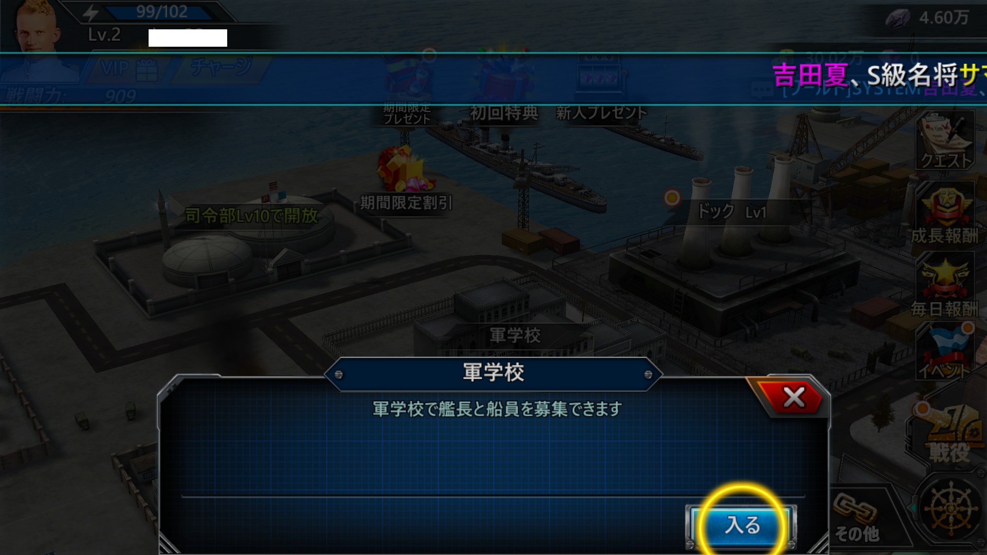 でさらに強い艦長を募集可能です。同じく「中級」実行後、一定の確率で「特級」募集