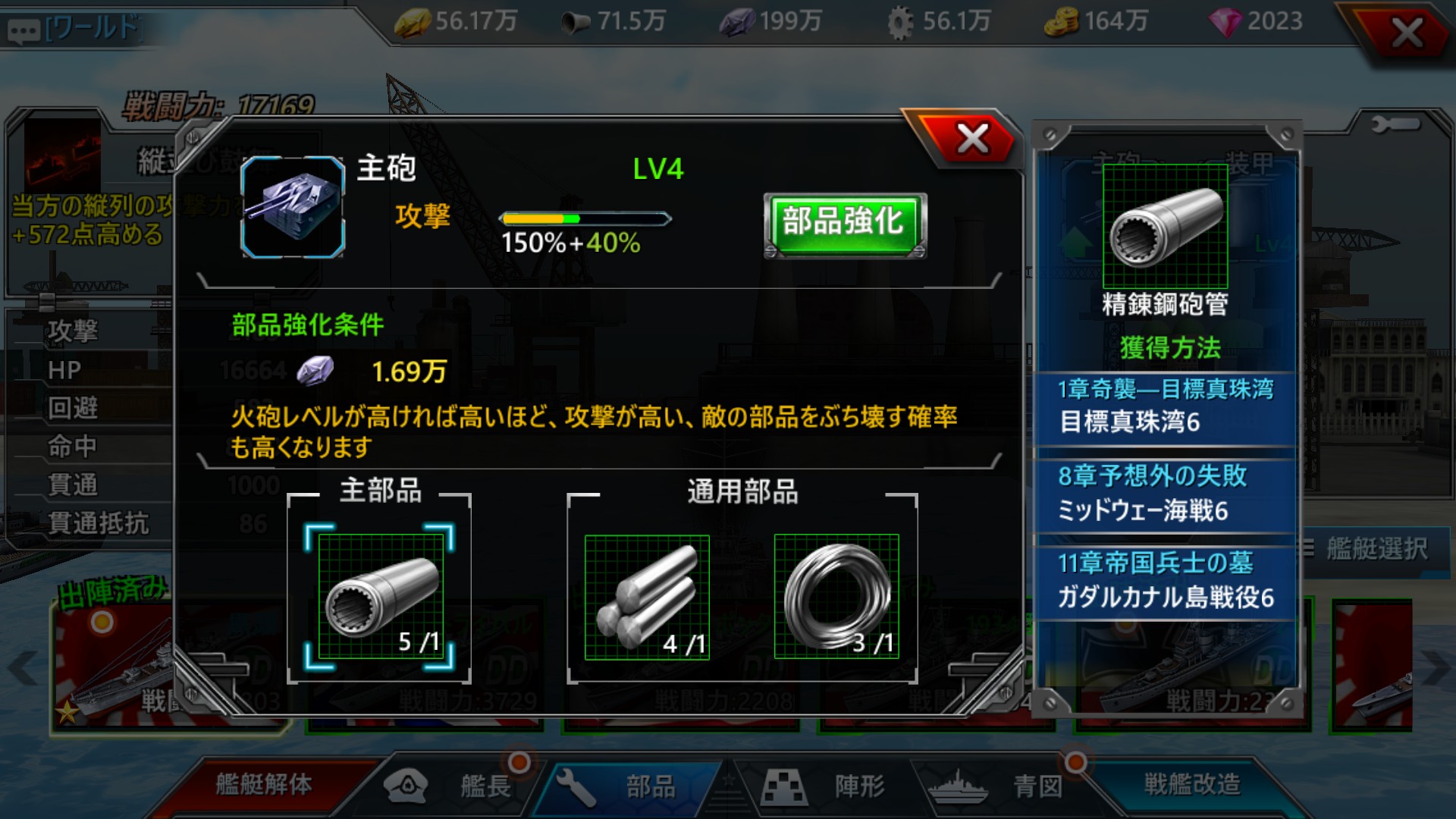 「主砲」「装甲」などかく部品を強化することで艦船は更に強くなります。