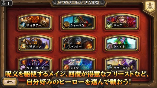 ハースストーンは1対1でプレイヤー同士の対戦を行うことがメインです。プレイヤーは異なった特徴をもつヒーローを選び、それに適したカードデッキを組んでバトルへ挑むことになります。