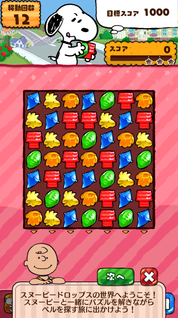 スヌーピーたちと一緒に、ドロップを3つ以上並べて消していくパズルゲームとなっています。
