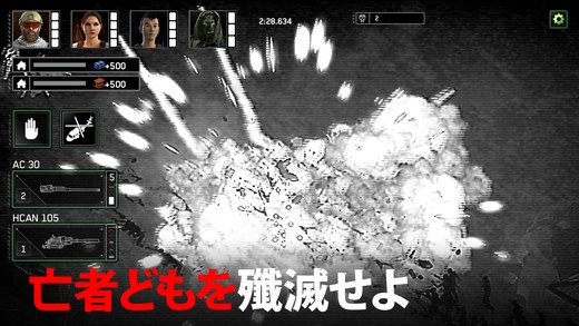 押している間は止まってくれますから、その間に破壊してしまいましょう。ゾンビの巣からはワラワラとゾンビが湧いてきます。近づく前に射撃で駆除することを忘れずに。射撃は画面左下の兵器をタップすることで行なえます。