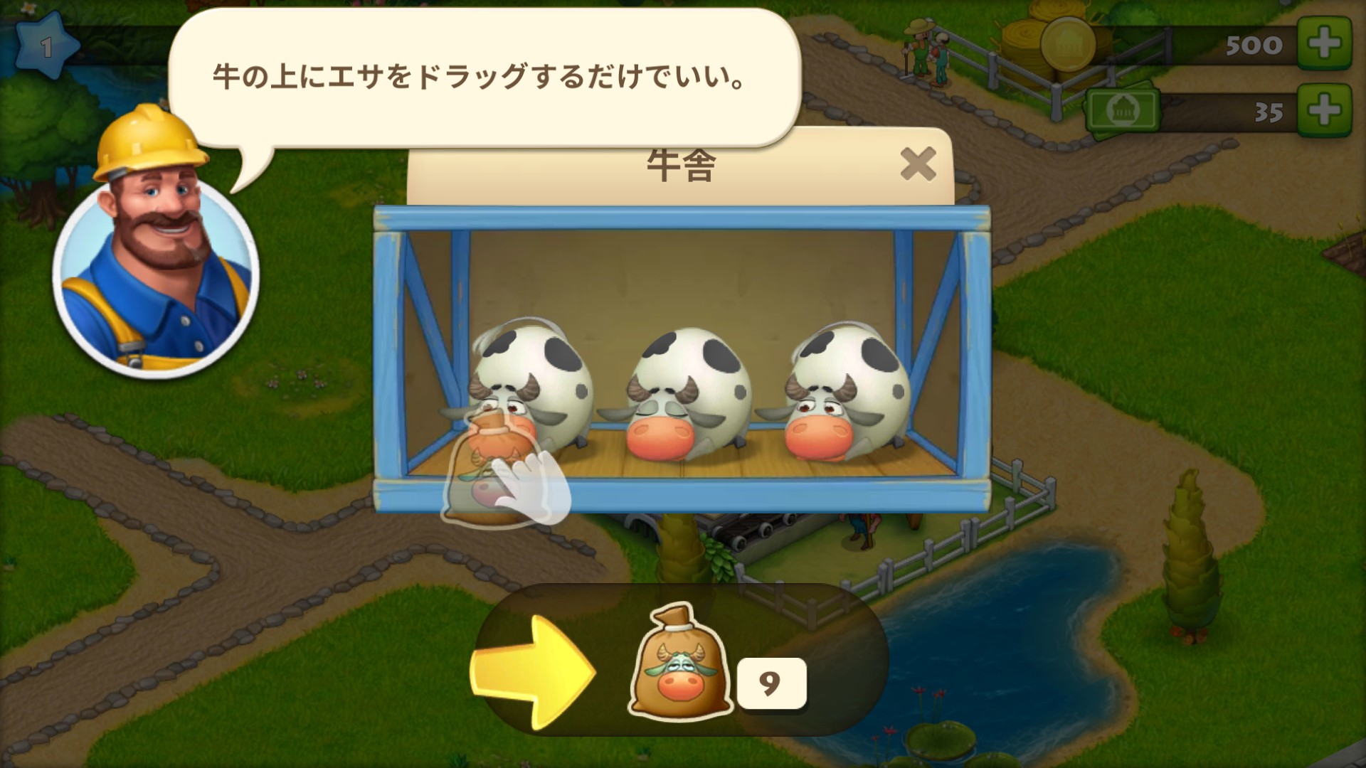 牛に餌をやるには「牛の餌」をタップし牛をドラッグすると餌を上げれます。