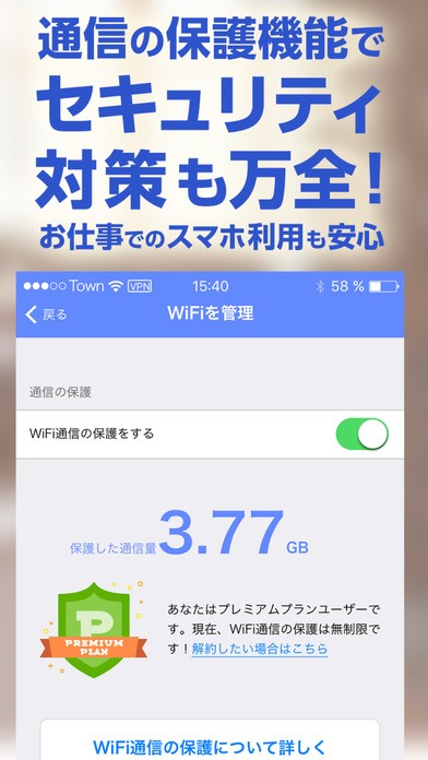 そんなときに安心なのが通信の暗号化。暗号化をすることでWiFi通信を保護することができ安全性が向上します。こちらの機能は有料となっており、月額300円のプレミアムプランを購入しなければなりません。