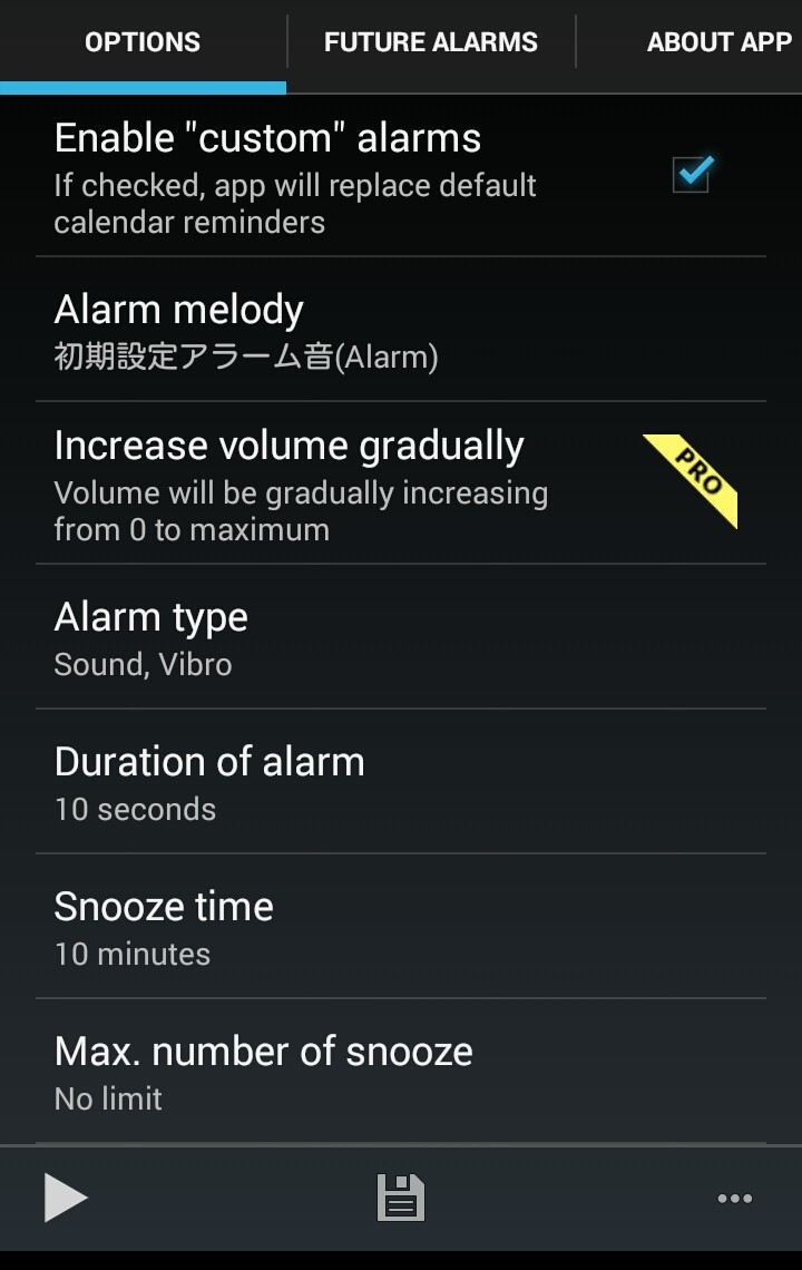 たとえば、Duration of alerm(アラームを何分前に通知するか)、Snooze time(スヌーズ間隔)といったものや、Alarm melody(アラーム音)やSilent hours(アラームを通知しない時間)などさまざまな設定を行うことができます。