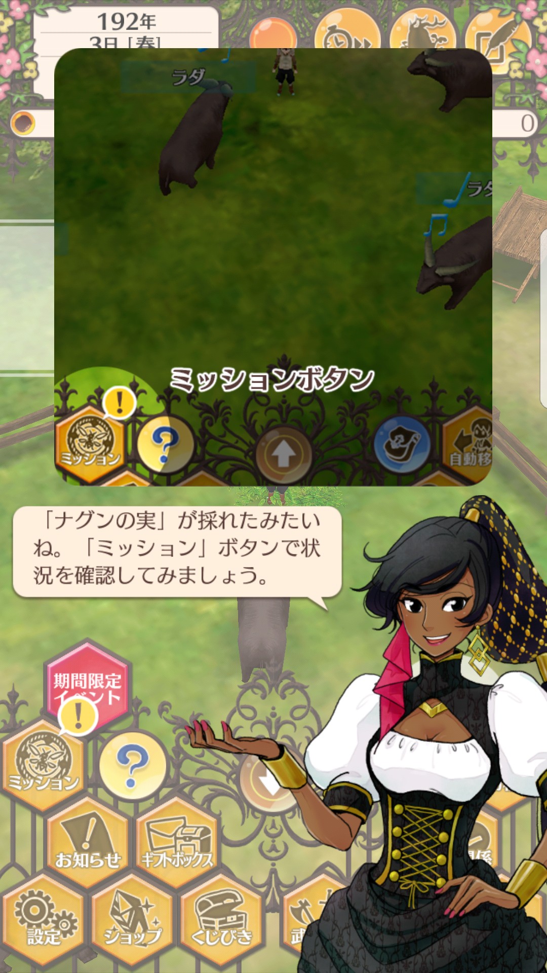 ミッションに必要なものがあつまると「ミッション」ボタンに「!」がつきます