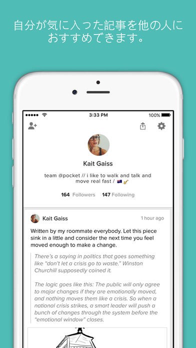 Pocketでは、フォロワーや友達などに情報を紹介することができます。たとえば「あの人これ好きそう」と思った情報をPocketに入れて、おすすめする、という使い方が可能。