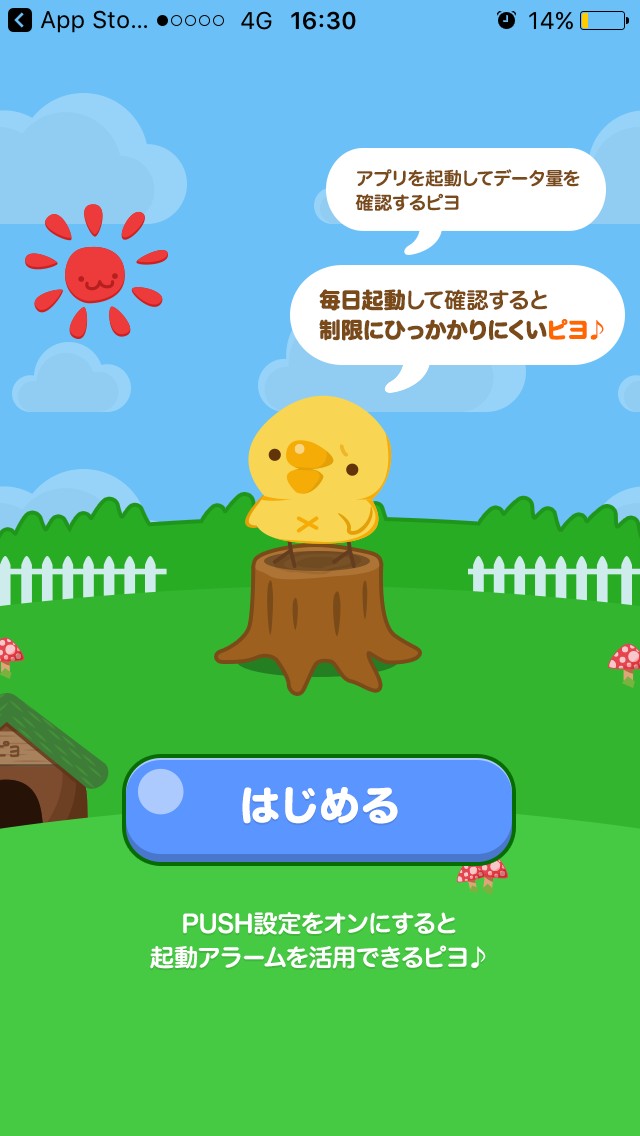 まずインストールすると、通知を送信することを許可するかという画面が表示されます。PUSH通知をオンにすると、設定した時間にアプリ起動をお知らせしてくれる起動アラームを活用できるので、選択してください。設定すると、はじめるボタンが表示されるのでタップしましょう。使用量画面が開いてパーセンテージ表示され、かわいいぴよのコメントもあります。