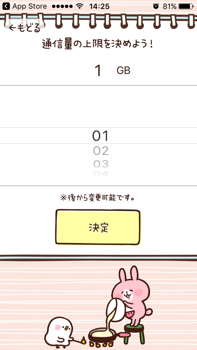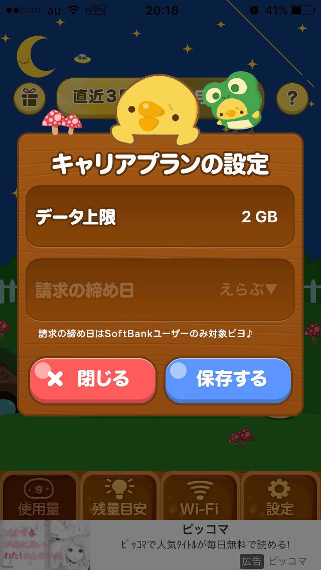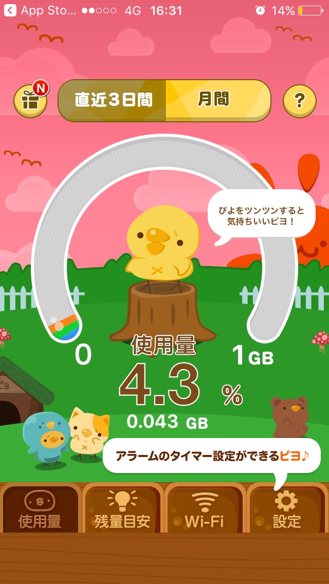 設定したら保存するボタンを押しましょう。月間画面に戻りますので、OKするをタップしてください。月間のぴよキャラは毎月変わるので、飽きずに使用量をチェックできます。