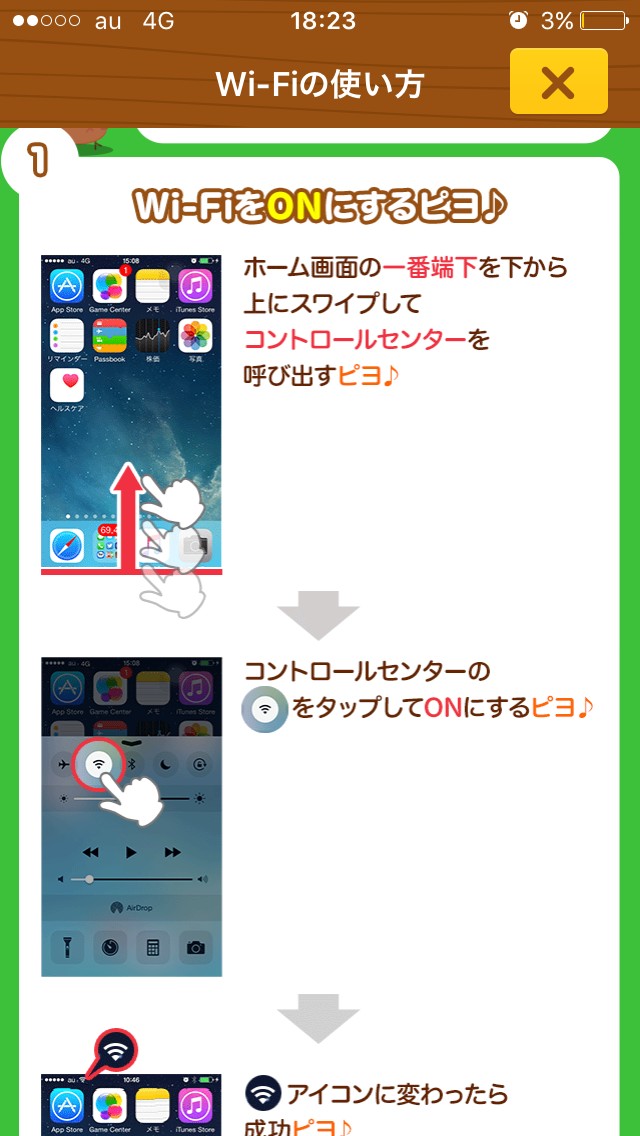 またWi-Fiの接続のしかたは、ホーム画面の一番下を下から上にスワイプして、コントロールセンター画面を開いてください。次に、画面の上部の飛行機マークのとなりの扇形マークをタップするとONになります。携帯画面の一番上に小さく扇形マークが表示されたら接続しています。