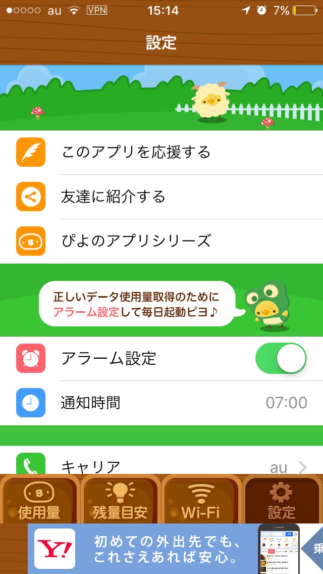 画面下部の設定を開いてみましょう。データ使用量を正確にはかるために、毎日アプリを起動できるよう、アラーム設定があります。アラーム設定の白丸を右にスライドさせ、通知時間を設定してください。キャリアは3社から選択し、データ上限は2GBから30GB内で選択しましょう。