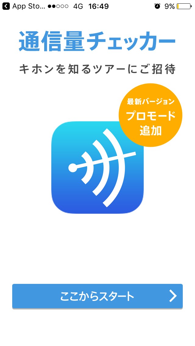それほど細かく通信量をチェックしなくてもよい人は、シンプルモードがおすすめです。最初にインストールすると、通知を許可するかの画面になるので、アプリ起動を知らせてくれるアラームを設定したい人は許可にしておきましょう。ここからスタートボタンの表示された画面になりますので、タップしてください。アプリの説明画面が続いて、ブルーのグラデーションのシンプルモードの画面になります。