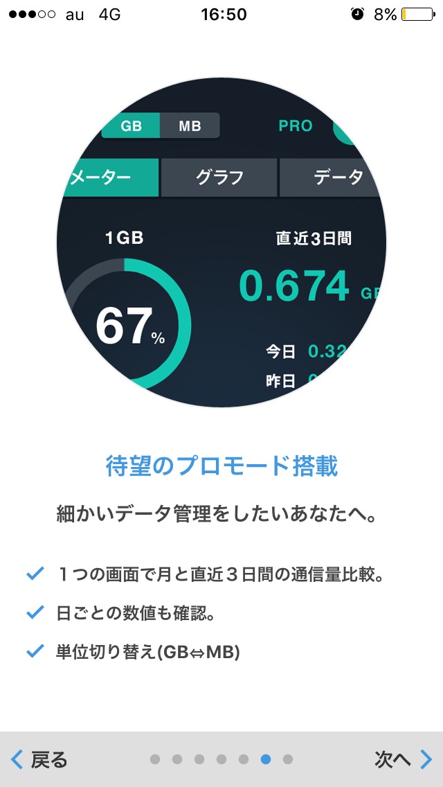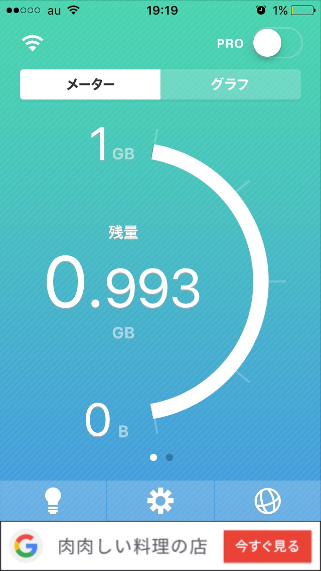 単に通信量が気になる人から、直近3日間で1GB超過して通信制限の可能性がある人まで、メーターやグラフから通信量の残量を分かりやすく表示してくれる「通信量チェッカー」アプリのシンプルモード。細かいデータ管理ができるプロモードもあり、自分が1日にどのぐらい通信量を使っているのか、とてもよく分かります。直近3日間と月単位での残量がGBとパーセンテージ表示されるメーターや、年月日ごとに表示されるグラフ、1日ずつ使用した通信量が分かるデータの3種類がプロモードにあります。