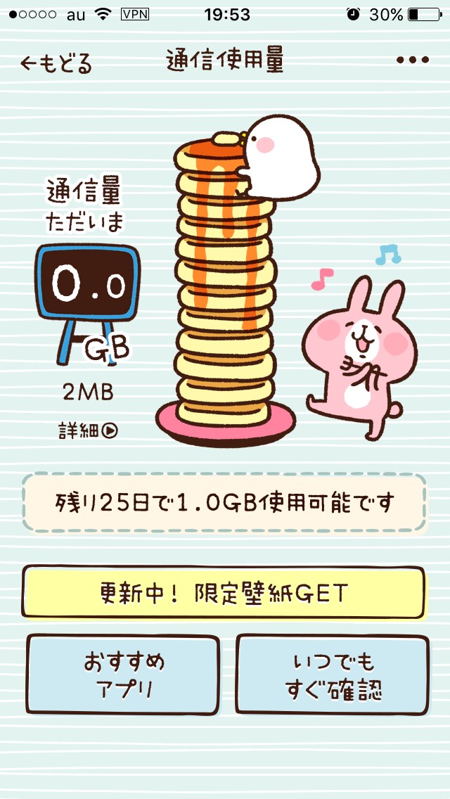 他にも、通信使用量画面にある「更新中!限定壁紙GET」をタップしてください。かわいい2匹の画像が表示されて、SNSで投稿すると限定壁紙がもらえます。