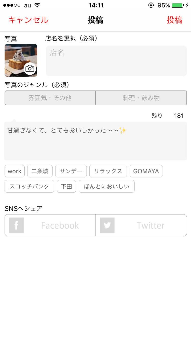 お店の名前、写真のジャンル、コメントなどを書くことができます。