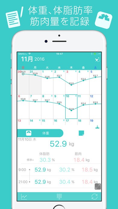 日々の体重を記録すると、初期画面上のカレンダーにグラフとして表示されます。良くあるカレンダータイプのダイエットアプリでは、グラフは別表示であることが多いので、これは見やすくわかりやすいと思います。体重の推移を眺めるグラフを出すためのワンタップが、積み重ねれば実は結構億劫だったりするものです。
