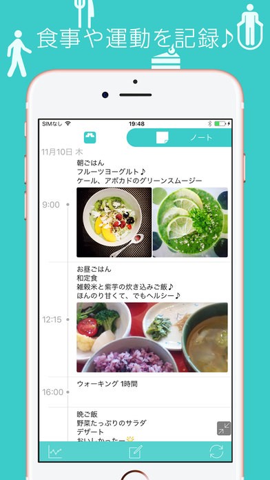 操作は、基本的には体重と体脂肪、筋肉量を入力するだけですが、食事の献立を書いたり、運動量を記録したりすることもできます。写真もアップできるので、日記のような使い方もできます。自分がこの日どういうふうに1日を過ごしたのか、何をどれくらい食べたのかが一目で分かります。「運動」と「食事」の項目が別々になっていないので、いちいち該当画面を開く必要がなく、また、1日の流れを把握しやすくなっています。食生活や運動面での取り組みを振り返るときに、とても便利です。