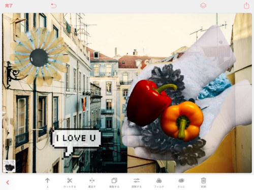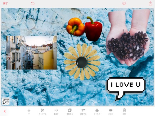 どうでしょう、だいぶコラージュっぽくなりましたね!ここまでに要した時間10分程度です。素人でこのタイムですから慣れたら5分と掛からないかもしれませんね!後は「完了」をタップし、保存します!