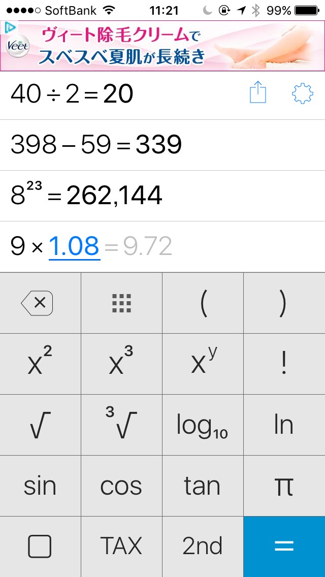 他の記号の計算も一発ですね。「x^2」であれば二乗の計算、「TAX」であれば「×1.08」をやってくれます。ここまで便利だともう手放せないですよね!