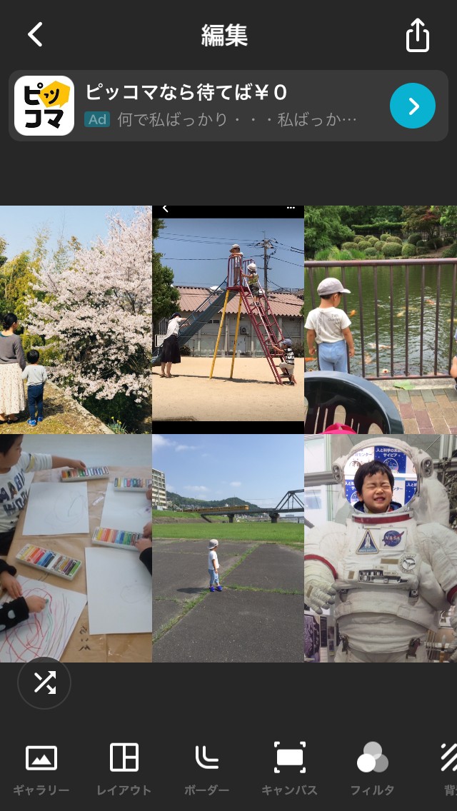 「Inshot」は動画だけではなく、コントラストや色合い、彩度などの豊富な機能を使って画像加工も楽しめます。トップ画面にある「コラージュ」を選択すると、画像を最大9枚使って、思い出をひとまとめにしたコラージュ写真を作成することができます。