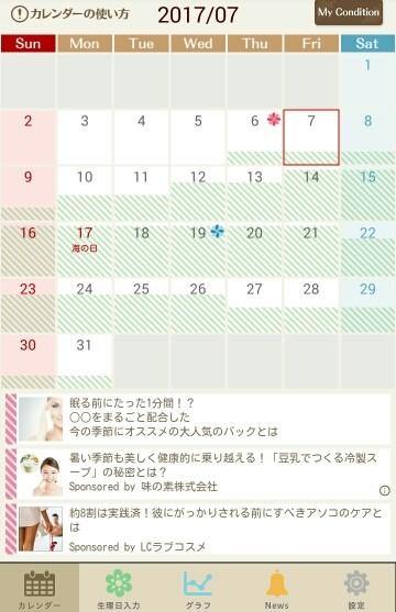 また、生理周期による体調指数をカレンダー画面にグラフで表示してくれますので、